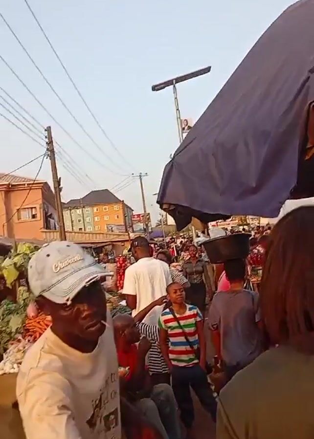 bustling outdoor market, crowded with people. Stalls with fruits, vegetables, and other goods line the path, creating a narrow corridor for shoppers. One man in a light-colored T-shirt and a baseball cap with the word "Chicago" on it faces the camera and seems to be making a small transaction. He has a cigarette in his mouth and is holding money in his hand. Behind him, people of all ages walk and interact, some carrying goods. Large blue canopies provide shade over some of the stalls. Power lines crisscross overhead, and in the distance, buildings of varying heights are visible. The overall atmosphere is vibrant and energetic, reflecting the activity of a busy marketplace.