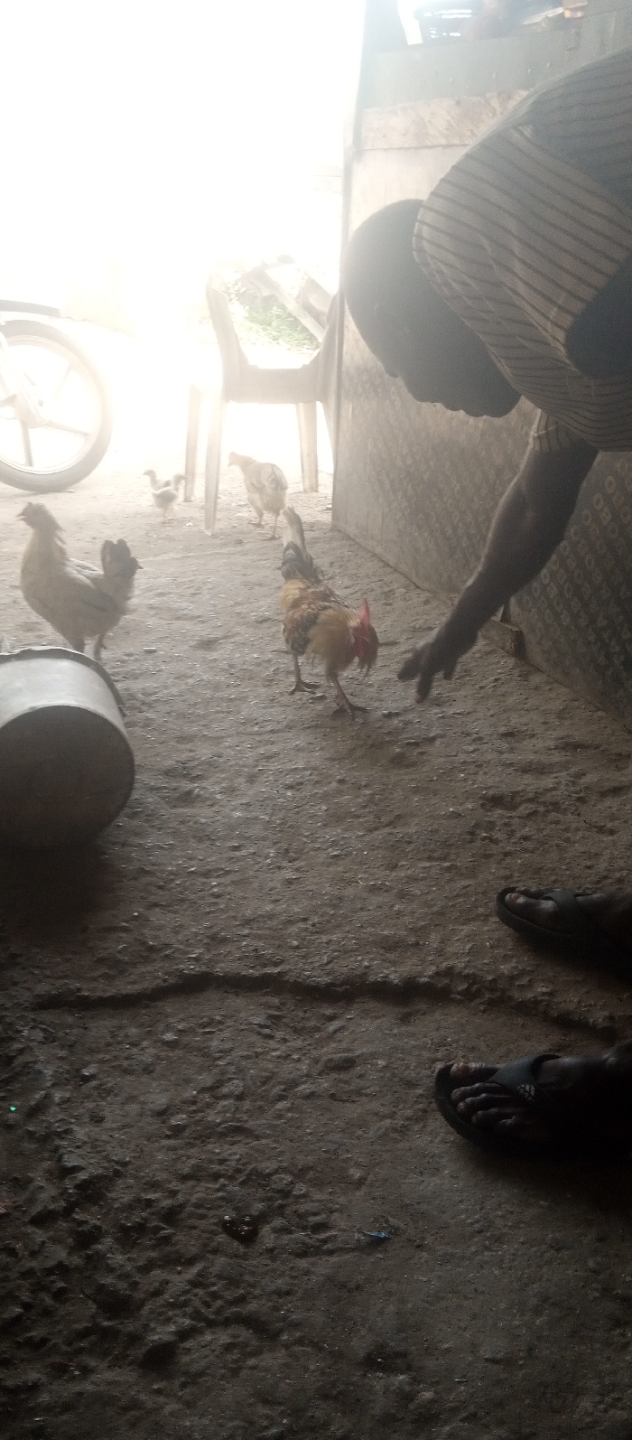 The scene depicts a partial interior or sheltered outdoor area in Adankolo, Nigeria, characterized by a packed dirt ground. Strong backlighting from the left creates a high-contrast environment, with the background overexposed. In the mid-ground, a dark-skinned individual wearing a striped short-sleeved shirt is bent over, extending their right arm and hand towards a multi-colored rooster positioned centrally, which appears to be interacting with the hand. To the left of the rooster, a light-colored hen stands near a cylindrical metal container lying on its side. Further back, near an overexposed white plastic chair, another light-colored chicken is visible, along with two smaller chicks. In the far-left background, part of a motorcycle wheel is discernible. The right side of the frame features a dark, vertically oriented wall or partition, possibly plywood, with faint text visible. In the lower right foreground, the feet of a second individual wearing dark flip-flops are visible.