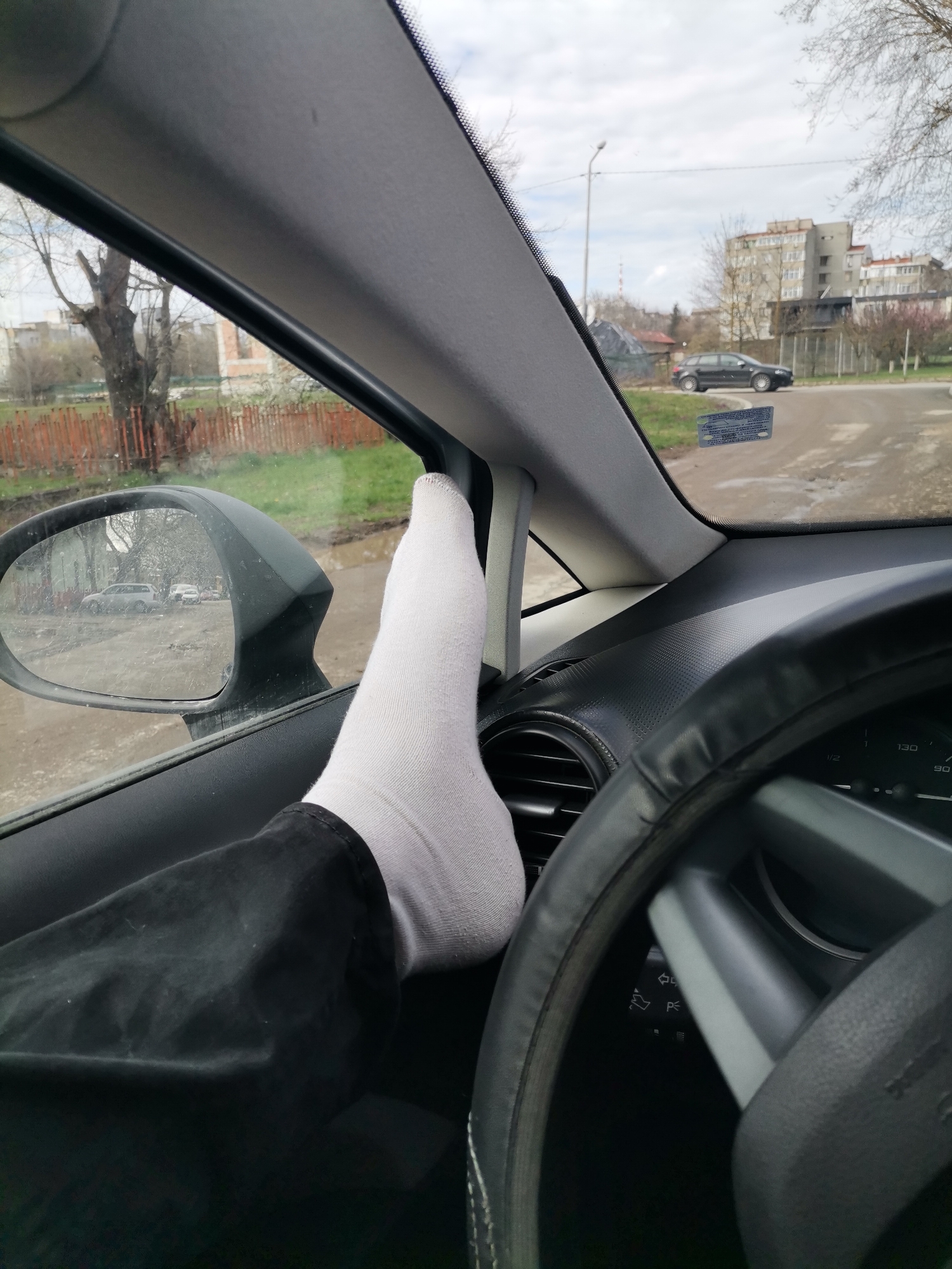 A view from inside a car shows a person's socked foot propped up against the A-pillar of the vehicle