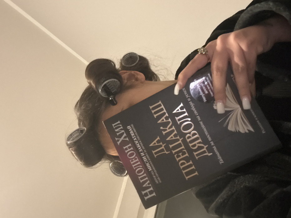 A person is depicted from the chest up, partially obscured by a book held in their left hand (viewer's right). The individual has dark hair styled with multiple large hair rollers. A small portion of the right side of the face and ear is visible. The person is wearing a dark, textured robe or garment. The visible hand displays long, white, square-tipped nails and a ring with a clear stone on the ring finger. The book, titled "НАПОЛЕОН ХИЛ ДА ПРЕЦАКАШ ДЯВОЛА" (Napoleon Hill, Outwitting the Devil) in Cyrillic script, features a subtitle reading "ТАЙНАТА ЗА ПОСТИГАНЕ НА СВОБОДА И УСПЕХ" (The Secret to Achieving Freedom and Success). A circular metallic-appearing sticker is affixed to the lower right of the book's cover. The background consists of a plain, light-colored wall with a subtle diagonal line in the upper right quadrant. The image provides no identifiable geographical markers to specify a location within Mönchengladbach, Germany.