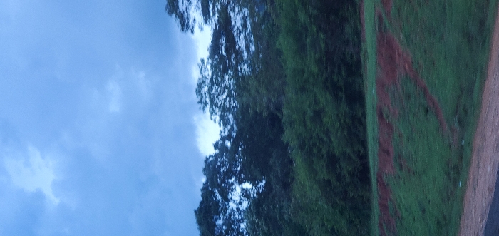 landscape with a cloudy sky on the left. Dense, dark green trees stand tall in the center of the frame. To the right, there is a mix of green grass and patches of red soil. A dark road runs along the very right edge of the picture. The image appears slightly underexposed, giving the scene a muted, overcast feel.