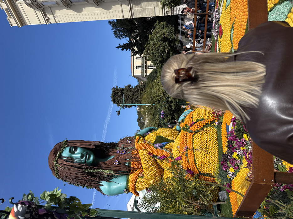 This image depicts an outdoor festival scene in Menton, France, likely during the Fête du Citron, under a clear blue sky with a faint contrail. In the immediate foreground, the back of a person's head and shoulders are visible, featuring light blonde hair styled with a brown claw clip, above a dark brown, leather-like jacket. This individual is positioned in front of a low wooden barrier, observing the central display. The prominent subject is a large, multi-component sculpture of a seated female figure. The figure's head and upper torso are colored in a teal-turquoise hue. Her hair is represented by textured dark brown strands interwoven with green foliage and small purple flowers. The remainder of the figure's body is intricately formed from numerous yellow lemons and orange oranges, arranged to create patterns resembling clothing, with additional small purple, pink, and white flowers, and green leaves integrated into the design. The sculpture rests on a base similarly decorated with citrus fruits and a variety of colorful flowers. Surrounding the base of the sculpture, the ground is adorned with further arrangements of lemons, oranges, and various planted flowers in shades of purple, pink, and yellow, alongside small green shrubs. In the midground to the right, a group of people is visible standing behind a low barrier, observing the display. The background includes green trees, a street lamp, and distant white buildings on a hillside to the left. On the far right, a tall, light-colored building with ornate architectural details, including multiple windows and cornices, rises vertically.