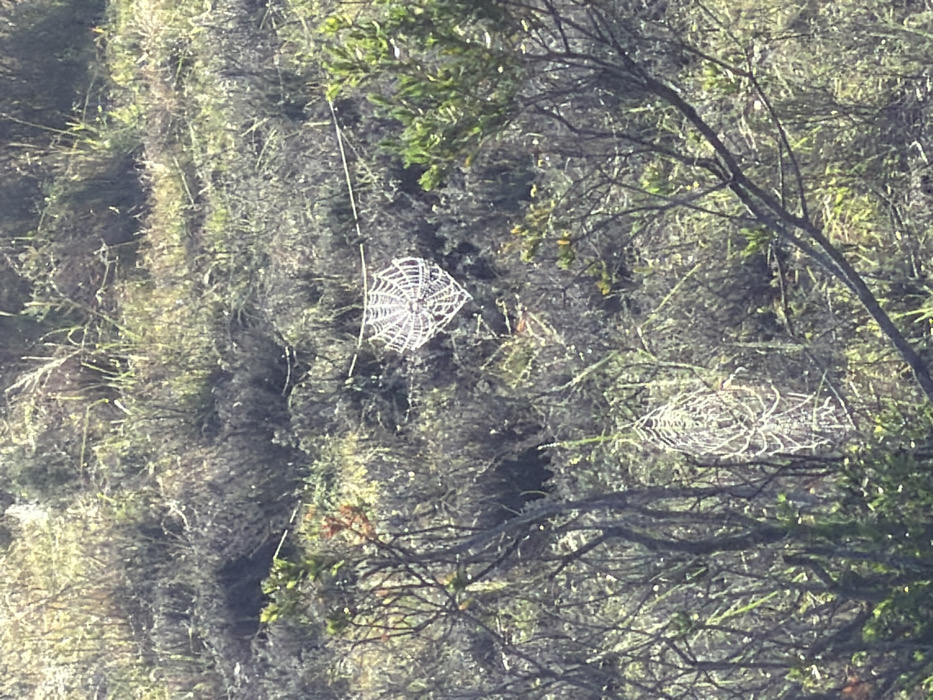 The image depicts a natural outdoor environment located in Hessequa Nu, South Africa. The scene is dominated by dense, low-lying vegetation consisting of various grasses, shrubs, and small bushes, presenting a mix of green, brown, and yellowish hues, consistent with a fynbos or similar biome. No human subjects or animals are visible. A prominent, intricate orb-weaver spiderweb is suspended in the mid-ground, positioned slightly to the right of the central vertical axis. The web is roughly heart-shaped, exhibiting radial spokes and concentric spirals, and appears coated with numerous small droplets, likely dew or condensed moisture, causing it to reflect ambient light intensely and appear white against the darker background. This web is seemingly attached to horizontal strands, possibly other web lines, extending across the vegetation. A second, less distinct spiderweb, also appearing to be an orb-weaver type, is partially visible in the lower-left quadrant, elongated and similarly glistening from reflected light. The overall lighting suggests natural daylight, illuminating the scene from an angle that highlights the moisture-laden spiderwebs.