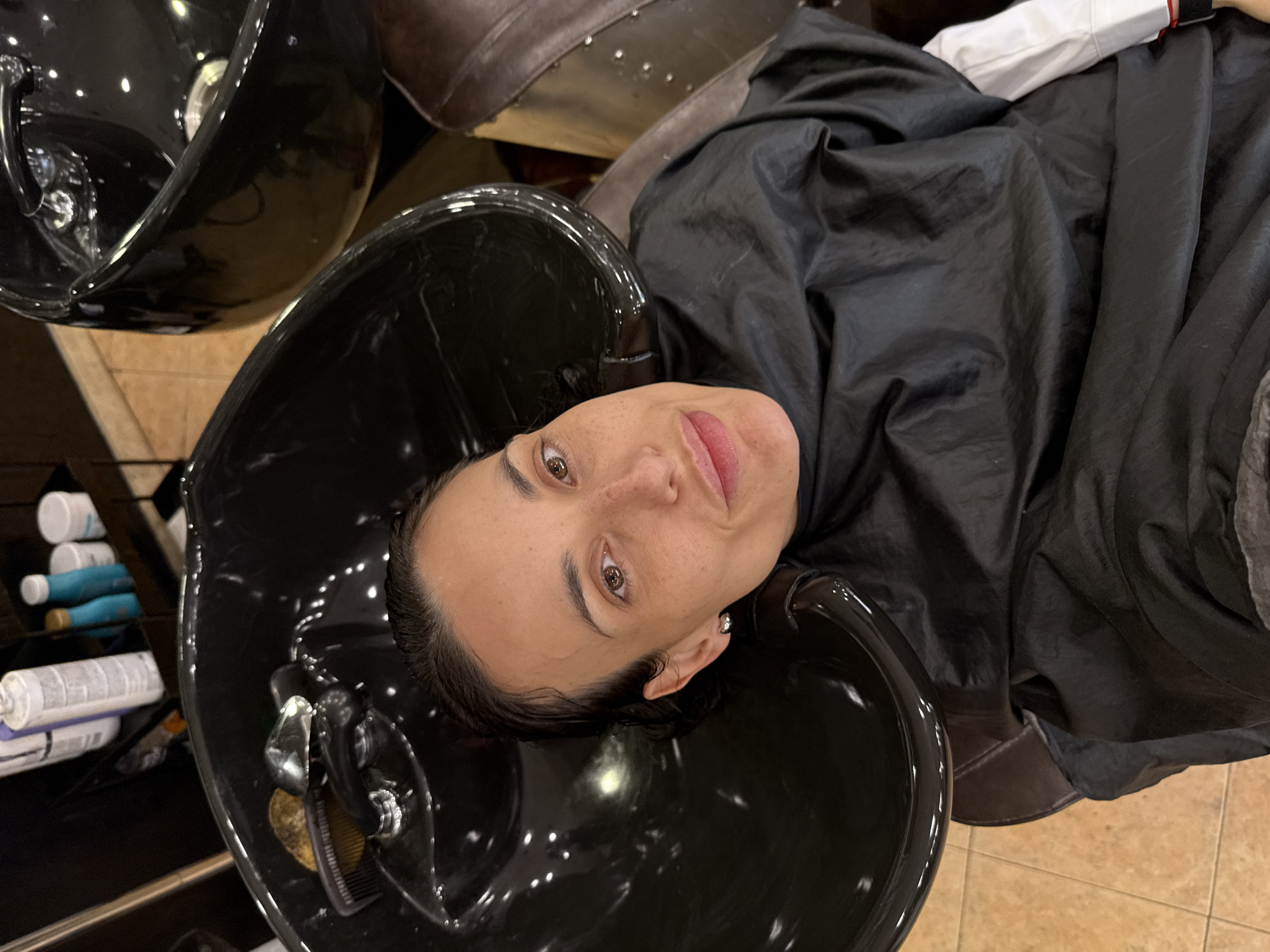 A woman lies on her back in a black salon chair, draped with a black cape and facing the camera