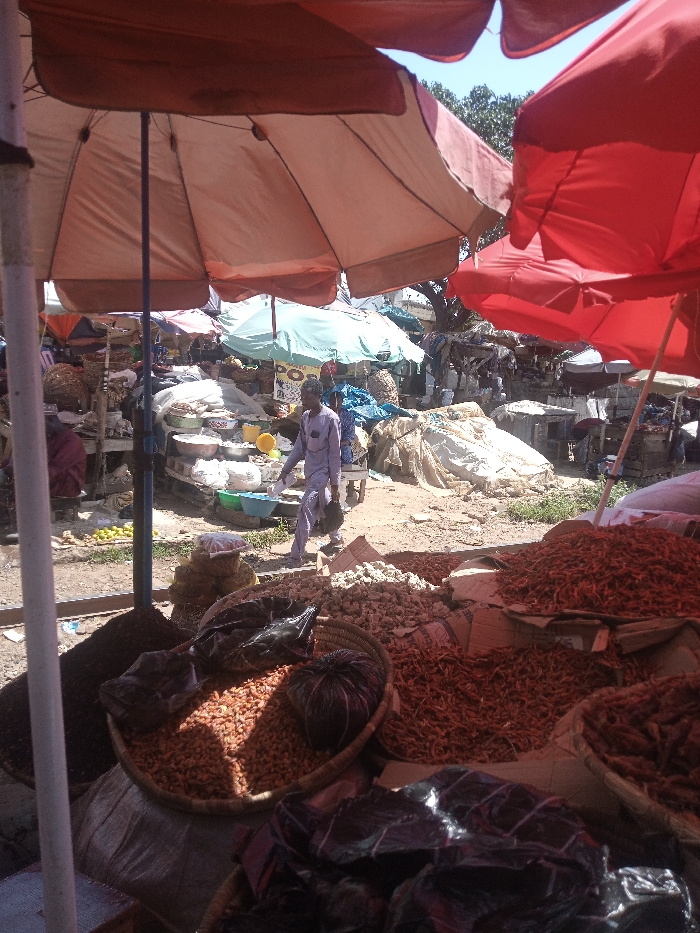 This image captures an outdoor market scene in Tudun Nupawa, Nigeria, under direct sunlight with clear skies