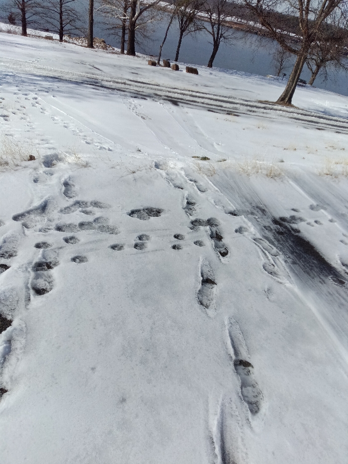A snow-covered landscape leads to a body of water framed by bare trees. Footprints in the snow crisscross the foreground, showing paths taken on the sloped terrain. A section of exposed dark earth cuts through the snowy surface. A row of dark, rectangular shapes sits near the water's edge, possibly benches or stones. The scene is cast in bright sunlight, with long shadows suggesting a low sun angle.