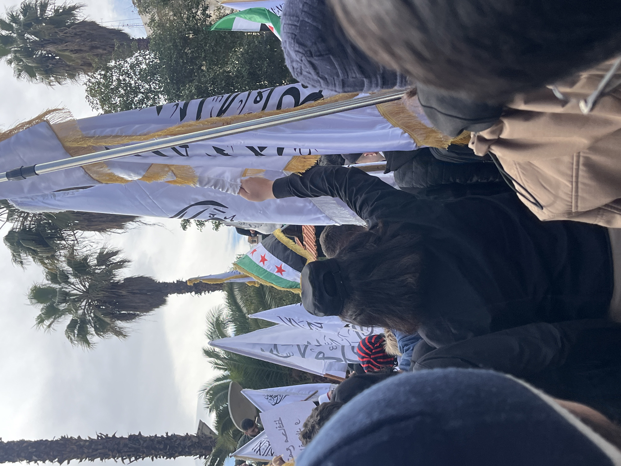 The image depicts a dense outdoor gathering of individuals in As-Salihiya Municipality, Syria, under an overcast sky. The perspective is from within the crowd, looking forward and slightly upwards. In the immediate foreground, a person wearing a dark blue beanie is partially visible on the left. To the right, the back of a person's head with dark hair is visible. Centrally, a person with long dark hair, wearing a black cap and a black long-sleeved shirt, is seen from behind, holding the metallic pole of a large white flag with their right hand raised. The midground is filled with numerous individuals, most seen from behind, wearing varied civilian attire including jackets and headwear such as a red and blue striped beanie. Several flags are prominently displayed. The large white flag held by the central figure features black Arabic script and is bordered with golden fringe. Multiple similar white flags with black Arabic script are visible throughout the crowd. To the right of the central flag, a Syrian opposition flag (green, white, black horizontal stripes with three red stars) is held aloft. A partially visible flag, possibly Palestinian, is also present on the far right. On the left, a white sign with black Arabic script, partially legible as "لثقله و حد ته," is held up. The background features several tall palm trees with dense green fronds against a gray, cloudy sky. Other green foliage is visible among the palm trees. Portions of urban structures, including what appears to be a building with reddish-brown roof tiles, are discernible in the distance. The overall scene suggests a public demonstration or rally.