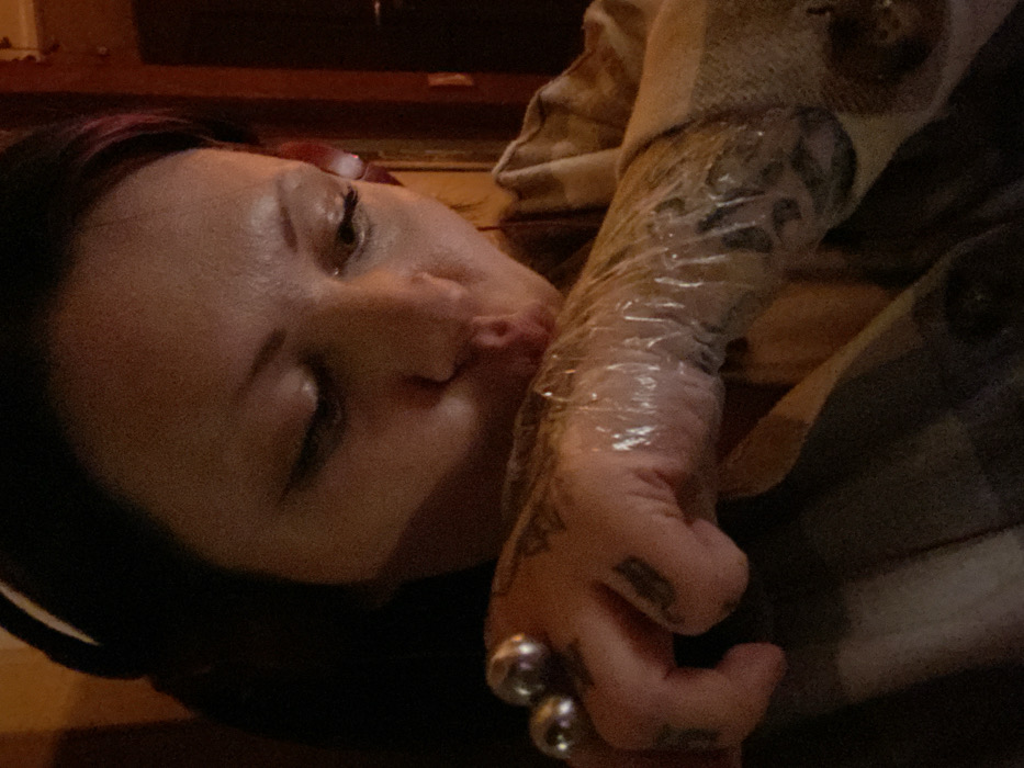 A woman with dark hair and a fresh tattoo covered in plastic wrap is lying down. She has a ring on her finger, and her eyes are closed. She appears to be wearing a flannel shirt. The lighting in the photo is dim, and the focus is on her face and tattooed arm.
