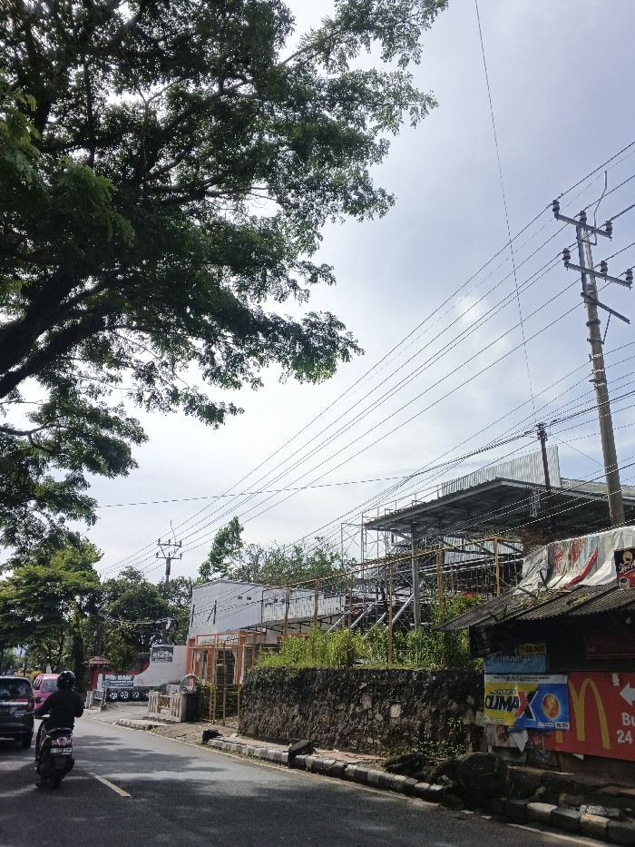 A street view features a leafy tree on the left, contrasting with a cloudy sky. Overhead power lines crisscross the frame. A building under construction, supported by scaffolding, sits behind a stone wall overgrown with greenery. Adjacent to it, a building with visible signage, including a McDonald's advertisement, stands to the right. A motorcyclist travels along the asphalt road towards the viewer. Cars are parked along the left side of the road.