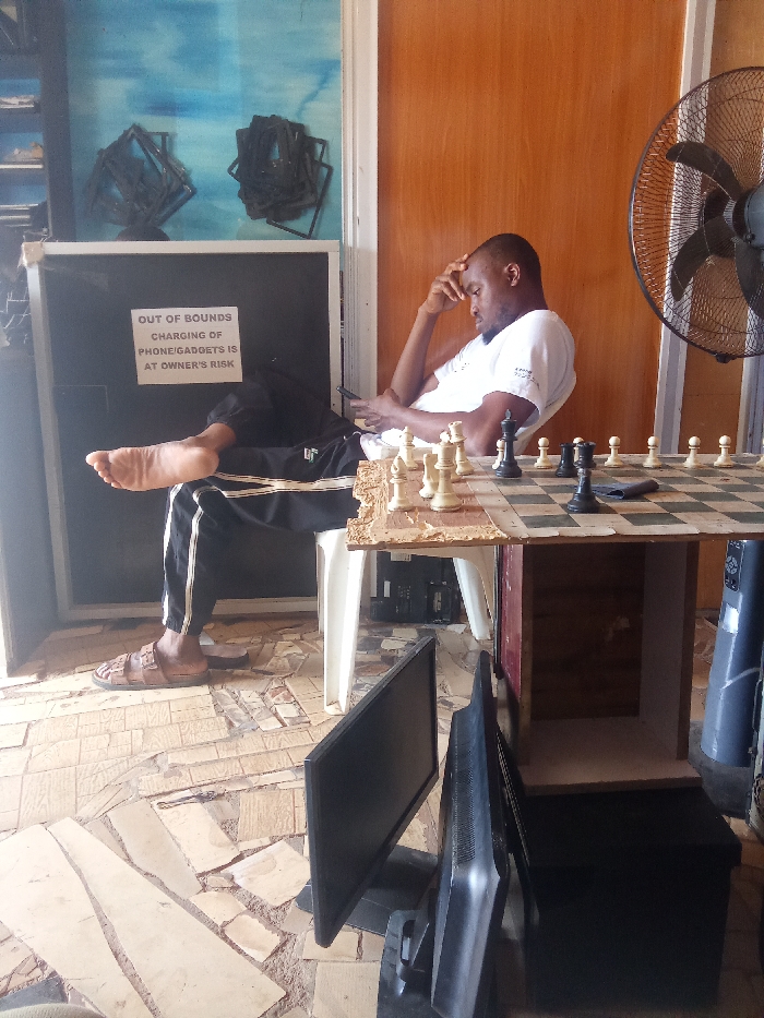 An indoor scene in Jos, Nigeria, features a male subject seated on a white plastic chair, positioned to the left of the frame. He wears a white t-shirt and dark track pants with white stripes. His right arm is bent with his hand touching his forehead, while his left hand holds a dark-colored smartphone, which he is observing. His right leg is crossed over his left thigh, exposing his bare right foot. His left foot wears a brown leather sandal. To the subject's right, a worn wooden chessboard with both white and black chess pieces is set on a light-colored wooden table. The chessboard's edges are visibly damaged. Below the table, two dark-colored computer monitors rest on the floor, leaning against each other. A black oscillating fan is mounted on the wall to the far right. Behind the subject, a black sign with white text reads: "OUT OF BOUNDS CHARGING OF PHONE/GADGETS IS AT OWNER'S RISK". Above this sign, on a light blue painted wall section, two dark, abstract geometric wall decorations are visible. The room's walls are a mix of light blue paint and light brown wooden paneling. The floor is composed of irregular, light-colored tile pieces arranged in a mosaic pattern.