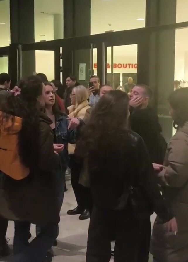 group of people gathered outside a building at night. There are about 15 people visible, mostly facing the entrance of the building. They are dressed in casual winter clothing. Some are talking to each other, laughing, and gesturing. One person is filming with their phone. The building has a large glass facade with the words "Entrée Schweizer" and "BRIDGES TO EUROPE 2025" visible. The interior of the building appears brightly lit.