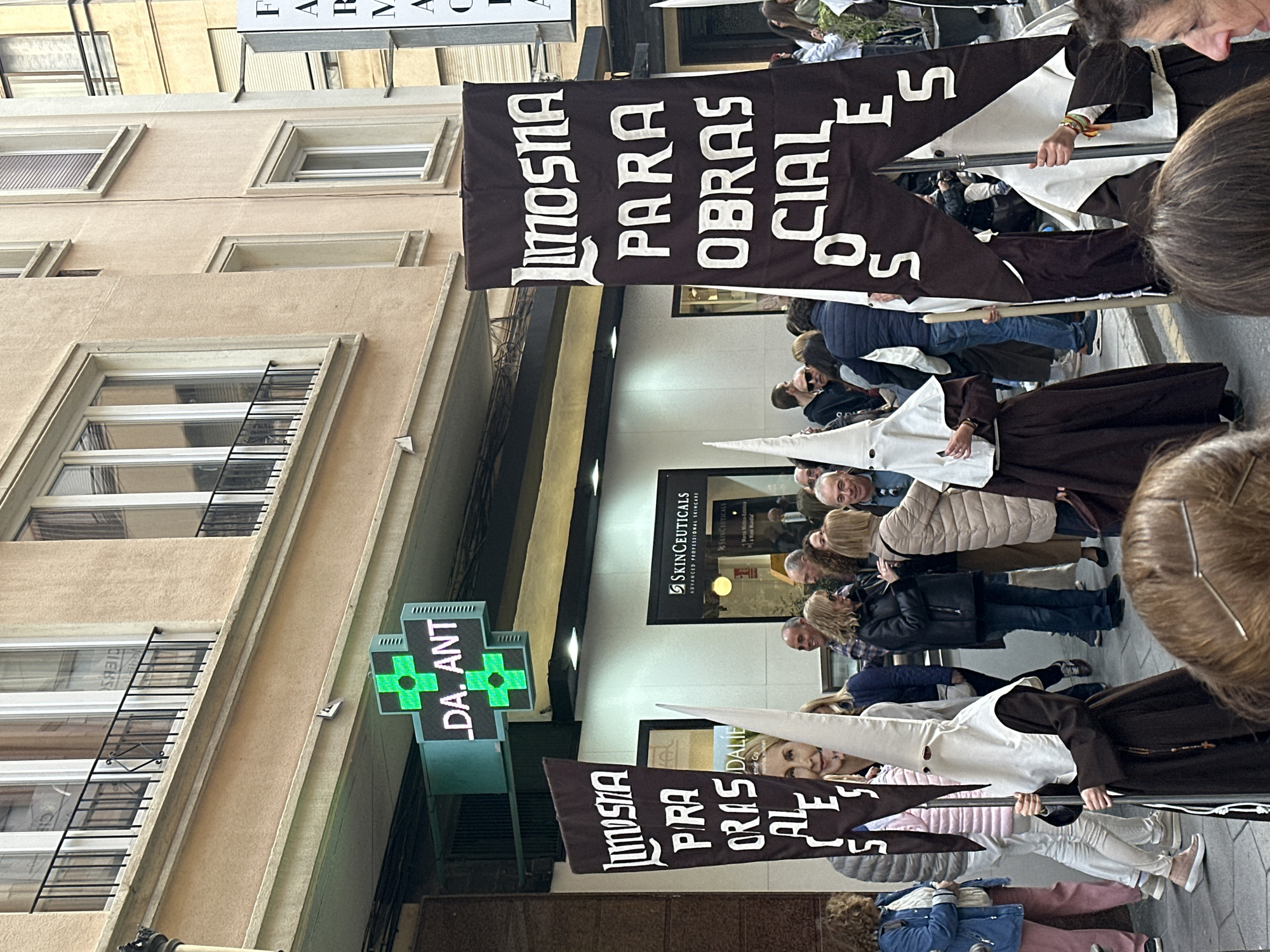 The image captures a street scene, likely in Alicante, Spain, as indicated by "LDA. ANT" on the pharmacy sign. The street is lined with buildings, one of which houses a pharmacy and a SkinCeuticals skincare center. A procession is taking place, featuring people wearing traditional religious attire with pointed hoods and carrying banners. The banners read "Limosna Para Obras Sociales", suggesting a charity collection for social works. The scene includes onlookers and a variety of clothing styles, suggesting a mix of participants and observers.