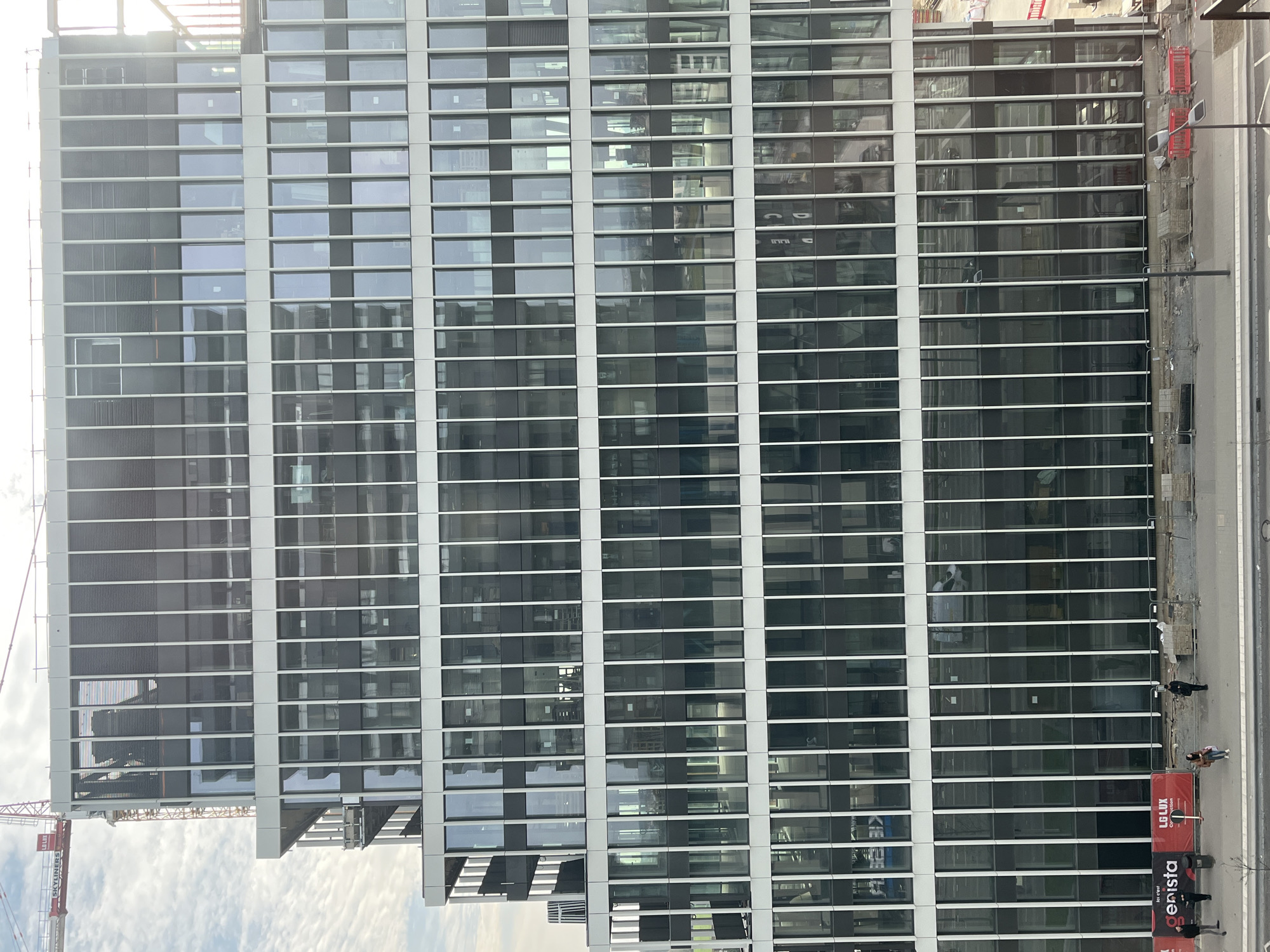 The image displays a large, multi-story modern building characterized by a glass and white-framed facade, reflecting a partly cloudy sky and internal structures. The building exhibits a stepped, terraced design on its left side, with visible balcony areas. A red-orange construction crane, marked "SKYLONERS" and "LULUX," extends from the top left of the frame, indicating ongoing construction. At ground level, a grey asphalt road is visible. Adjacent to the road, a construction zone is present, delineated by grey metal mesh fencing with concrete bases and red plastic barriers. A red and black banner-style hoarding on the left prominently displays "Ici c'est Genista" and "LG LUX Construction" logos. Stacks of paving materials are visible behind the barriers. Two dark grey streetlights with angular heads are positioned within the scene. Four adult individuals are on the paved area or sidewalk in front of the construction barriers. Two are on the far left, seemingly walking rightwards. A third individual stands centrally, facing away, wearing a light-colored jacket and dark pants. A fourth person stands to the right, dressed in dark clothing. The scene is located within a modern development area, specifically in the Kirchberg district of Luxembourg City, Luxembourg.