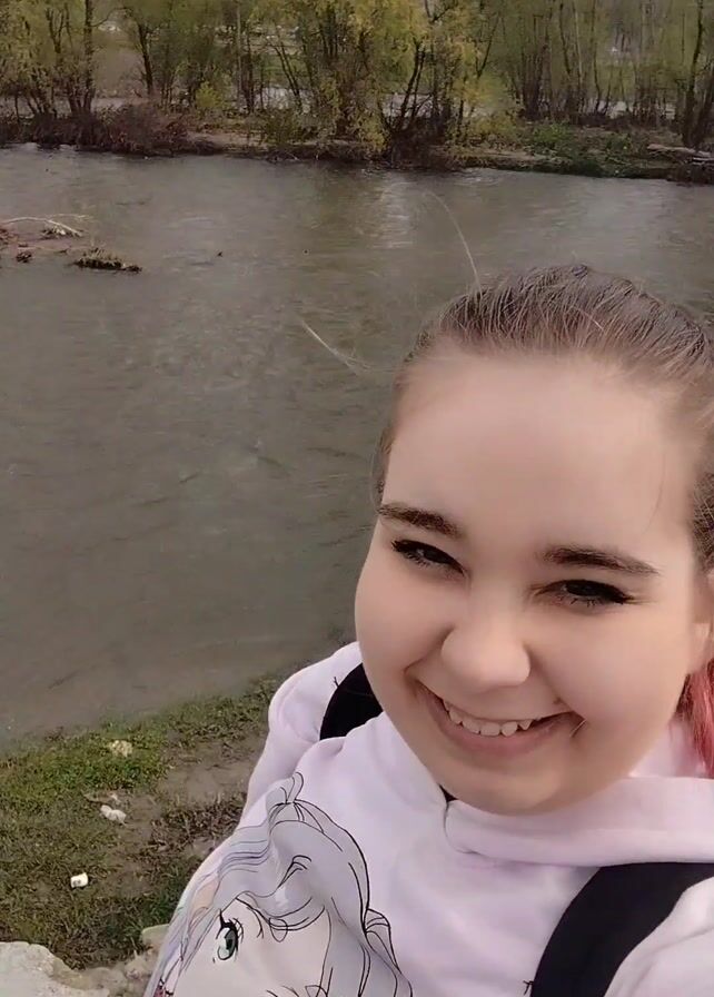 young woman smiling and taking a selfie. She is standing by a river with trees in the background. The river is flowing and there is some debris in the water. She turns the camera upwards to show a building across the street. The woman's hair is pulled back and has some pink dye in it. She is wearing a white hooded sweatshirt with a cartoon character on it. She is wearing a backpack.