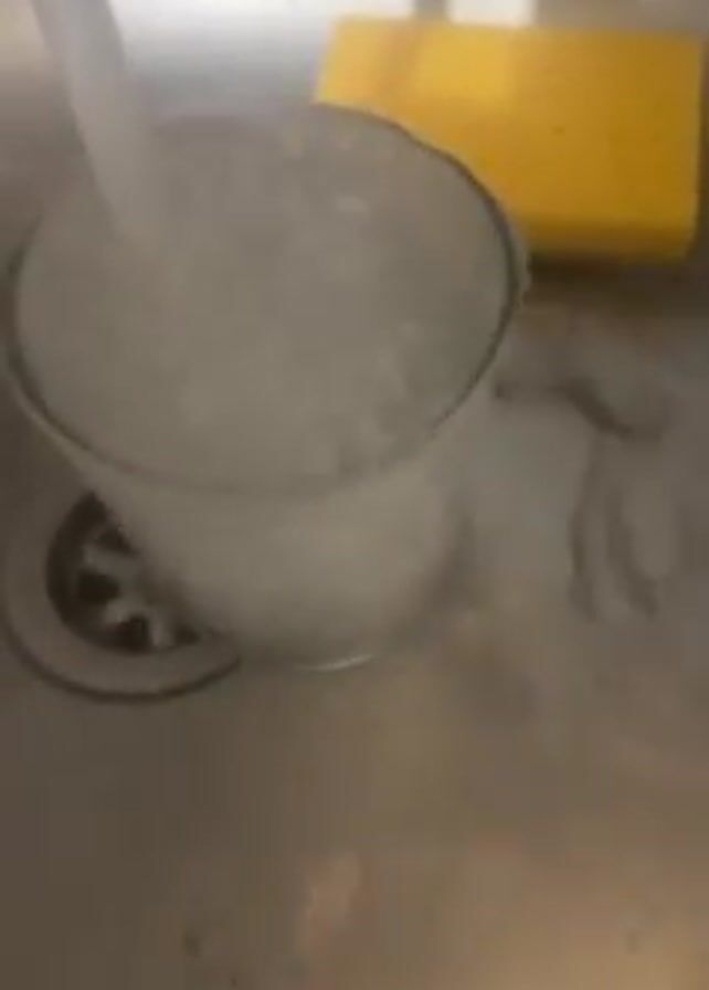 glass mug being filled with water in a stainless steel sink. The water overflows as it fills, and there is a yellow sponge next to the mug. The sink drain is visible.