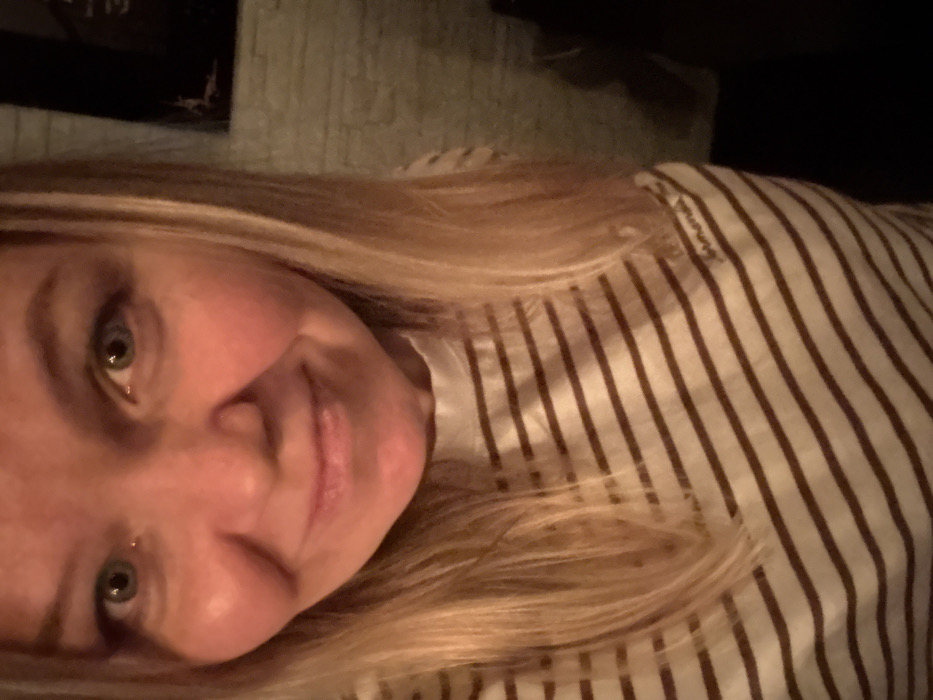 The image displays a close-up, chest-up view of an adult female with fair skin, long blonde hair, and blue-green eyes, looking directly at the camera with a subtle, closed-lip smile. Her face appears evenly illuminated by a direct light source. She is wearing a light-colored long-sleeved shirt with horizontal dark brown stripes. A small, dark "banana" logo or text is present on the upper left chest area of the shirt. The background on the right side of the subject features a light-colored, textured wall composed of stacked horizontal segments, resembling brick or stone. A dark, indistinct object, possibly a framed item, is partially visible in the upper right background. The specific location within the city of Chaikovsky, Russia, cannot be determined from the visual information provided in the image.