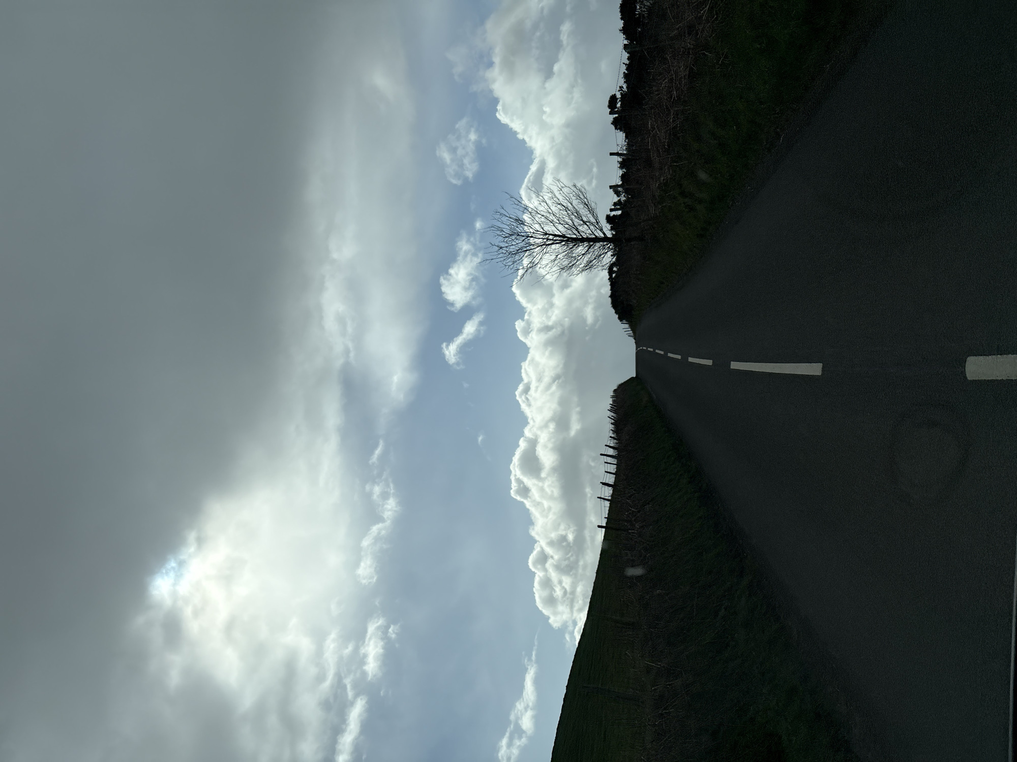 The image displays a narrow, dark grey asphalt road, marked with a dashed white center line, ascending towards a crest in Pulverbatch, United Kingdom. On the left side, a steep, dark green grassy embankment rises, topped by a fence constructed of wooden posts and wire. On the right, a less abrupt embankment is densely covered with dark, bare shrubs and dry vegetation. A single, prominent leafless deciduous tree stands silhouetted on this right side, positioned behind the shrubbery, with another fence visible further back. The sky above features a dynamic mix of bright blue patches, bright white cumulus clouds, and darker grey cloud masses. A strong light source, likely the sun, is visible breaking through a cloud opening in the upper left quadrant, creating a bright glare. No individuals or vehicles are present in the visible scene.