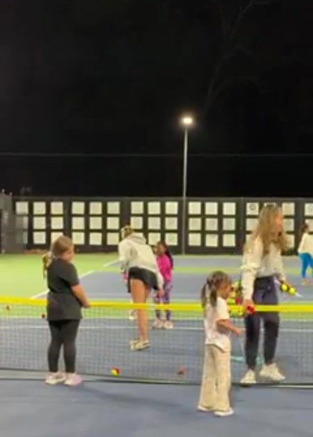 A night shot captures a tennis court with several individuals visible. On the left, a young girl in a black t-shirt and leggings watches the others. An adult in a light hoodie and dark shorts is near the net, interacting with other children. Another young girl with long hair and a patterned outfit is also near the net. Further back on the court, another adult in a white top and blue leggings is coaching. A container filled with tennis balls sits near the net. The court is illuminated by overhead lights against the dark background.
