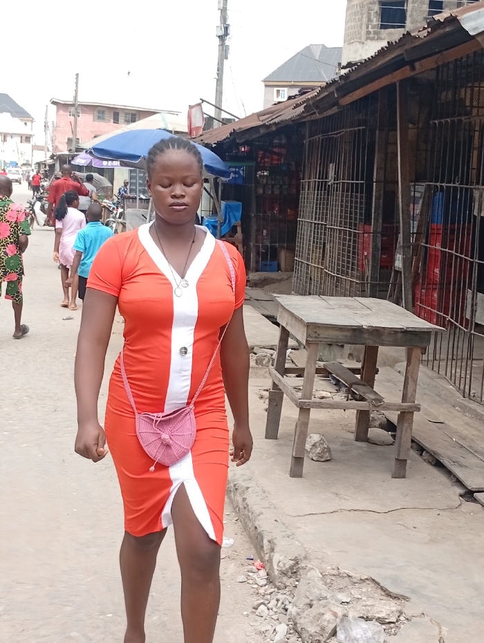 The image depicts a daytime street scene in ARIDICA, Nigeria. In the foreground, a dark-skinned woman with braided hair, wearing an orange and white bodycon midi-dress with a front slit and a single button closure, walks towards the viewer with her eyes closed or cast down. She wears a thin black necklace with two silver-colored rings and carries a small, pink, woven, heart-shaped crossbody bag. To her left, a bustling street is visible with several pedestrians, including a person in a colorful patterned shirt, and children. In the mid-ground, a blue market umbrella shades a stall. To her right, a series of market stalls or shops with corrugated metal roofs and metal grate security barriers line the street. Inside one stall, various packaged goods and containers are visible. A crudely constructed wooden table or bench stands on the uneven dirt and concrete ground to the right. Red and blue plastic crates are also present near the stalls. Utility poles and additional buildings are visible in the background, under an overcast sky. The ground surface shows cracks and debris.