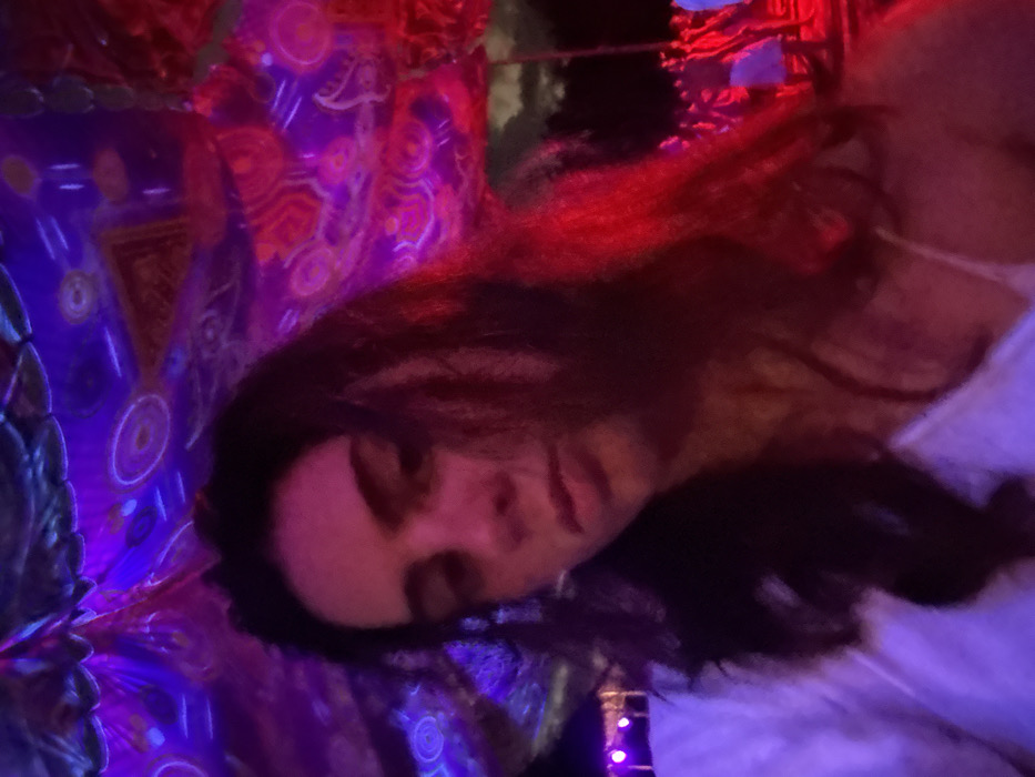 The image depicts an outdoor nighttime event in Ban Mae Ping, Thailand. In the foreground, an individual with dark, shoulder-length hair is visible, facing the camera with a neutral expression. The person is wearing a light-colored top, possibly white, with a thin strap visible on the right chest area. Their face and upper body are illuminated by purple and red artificial light. Above the individual, a decorated fabric canopy spans the upper portion of the frame. This canopy features intricate glowing circular and geometric patterns, illuminated by purple and red lights, suggesting a festive or psychedelic ambiance. To the far left in the background, faint purple lights indicate an unidentified structure or decorative element. To the right of the primary subject and further in the background, a crowd of multiple indistinct figures is discernible, heavily illuminated by bright red light. These figures appear to be engaged in an activity, consistent with a social gathering. Dark foliage or trees are visible above the crowd against the dark night sky. The scene is characterized by vibrant, multi-colored artificial lighting, predominantly purple and red.