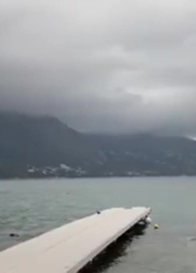 The scene captures a cloudy day by the sea. A long, white pier extends into the water, with a backdrop of mountains shrouded in low-lying clouds. The sky is overcast with hints of sunlight peeking through towards the right side. The water is calm and slightly choppy, with a few yellow buoys visible near the pier. The mountains are covered with some greenery, punctuated by houses and buildings along the coastline.
