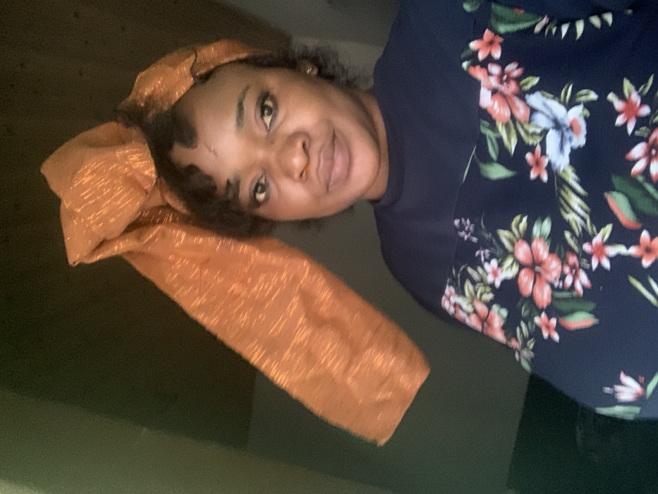 A woman smiles, wearing a floral print top and a copper-colored, shiny headwrap with a large bow. Her skin tone is dark, and she has dark hair and eyes. The background appears to be an interior space with dark walls. The image is slightly angled.