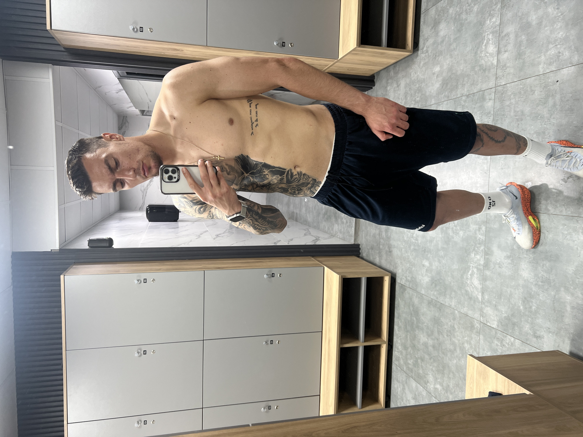 A shirtless man with tattoos and a gold chain stands in what appears to be a locker room, holding a phone and taking a selfie