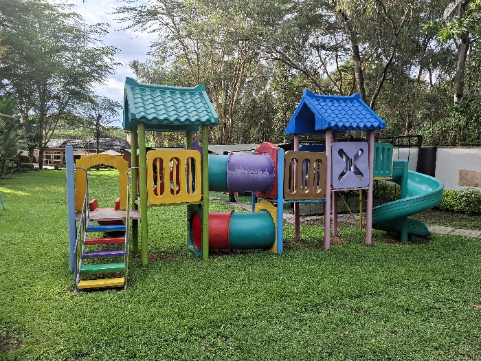 A playground located at coordinates -0.754, 36.438 in the city of Karagita, Kenya. The playground is made of brightly colored plastic and metal. There is a large green slide, a tunnel, a climbing frame, and a small slide. The playground is surrounded by green grass and trees. The area is well-maintained and appears to be in a residential or community setting. There are no people visible in the image. The playground appears to be empty and not currently in use.