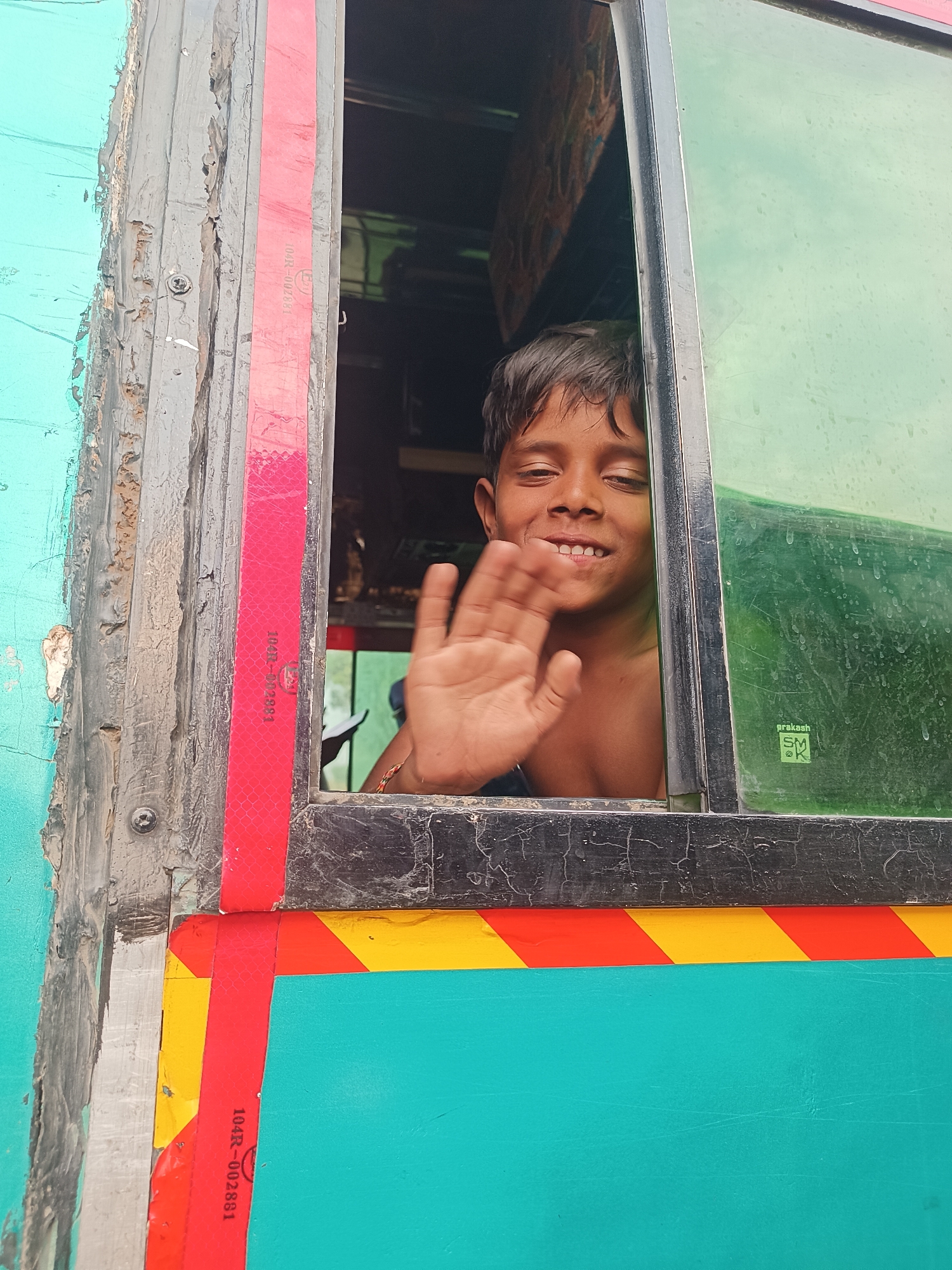 A young boy, appearing between 8-12 years old with dark, disheveled hair, is observed leaning out of a vehicle window in Kottalapalli, India. He presents a smiling expression, revealing teeth, and is shirtless. His right hand is raised and open, performing a waving gesture, with a multi-colored string bracelet visible on his wrist. The immediate environment consists of the vehicle's window and its frame. The window frame is dark, heavily worn with peeling paint and visible fasteners. A vertical red reflective strip, marked "104R-002881" and bearing a circular emblem, runs along the left side of the frame. The closed portion of the window on the right features a green-tinted or green-colored pane, which appears textured or dirty, and displays a sticker with the text "prakash SM @K." Below the window and to its left, the vehicle's exterior is painted a prominent teal/turquoise color. A horizontal strip of yellow and red diagonal reflective markings is visible directly beneath the window. The interior of the vehicle behind the boy is dark and indistinct.