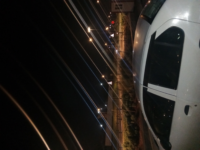 At night, a white vehicle, possibly a van, dominates the right side of the frame. The car's windows are dark, reflecting the night. Parallel light streaks stretch across the left side, curving at the bottom. A road lined with lampposts and greenery runs behind the vehicle. The overall perspective is rotated, creating a dynamic and somewhat disorienting view of the scene.