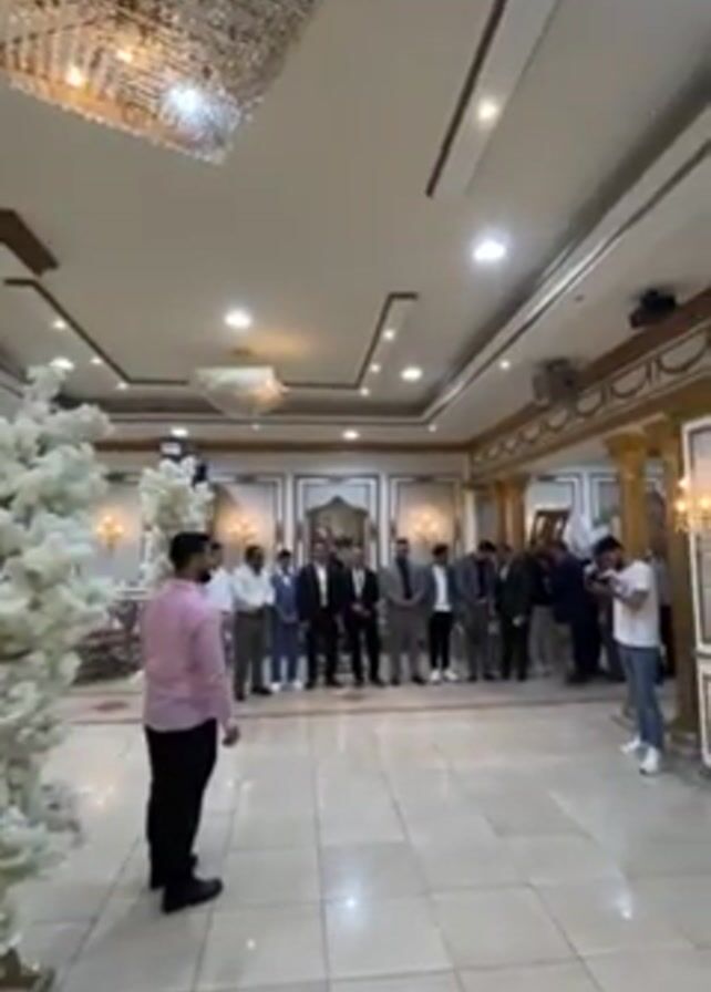 group of men standing in a lavish room. There are about a dozen men lined up against a wall, most of them in suits. Another man is facing them, with his back to the camera, wearing a pink shirt and black pants. The room features a tiled floor, ornate wall paneling, and a large chandelier. There are white decorative trees along one side of the room. A man in a white t-shirt and jeans is taking photos or videos of the group with a camera. One man appears to be greeting another with a handshake.