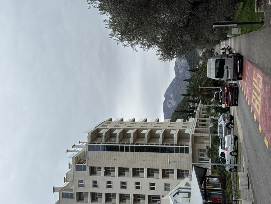 The image depicts a street scene in Petrovac na Moru, Montenegro, under an overcast sky. On the left, a tall, multi-story building of modern design with light-colored stone cladding features numerous balconies with clear glass railings and large windows. Below this structure, a smaller building with a dark, sloped roof and extensive glazing is partially visible. The paved road in the foreground displays a marked red 'BUS' lane with yellow lettering. Vehicles present include a white compact sedan parked diagonally on the left, followed by a silver SUV, a dark red SUV with a roof-mounted cargo box, and a grey cargo van positioned consecutively, all facing away from the viewer. One person, wearing a white top, is visible near the rear of the dark red SUV. The right side of the road is bordered by a concrete sidewalk and a row of olive trees. In the background, green vegetation, including palm trees, ascends towards prominent, bare mountains under a uniformly grey sky.