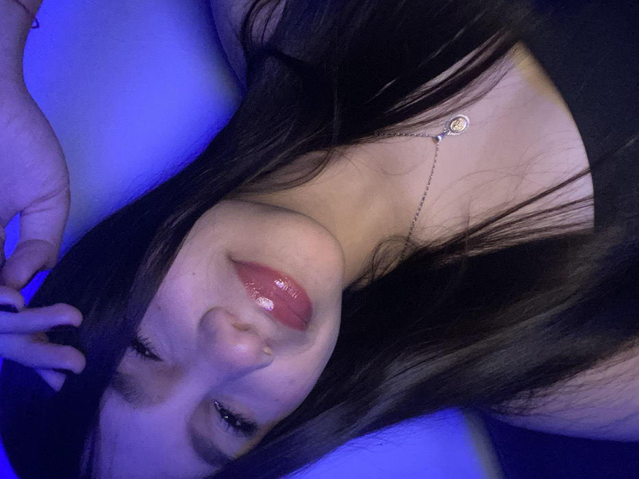 The image displays a close-up, angled portrait of a single young female subject, illuminated primarily by an intense blue light source. Her head and upper torso are visible, framed against a plain blue background, indicating an indoor setting with artificial lighting. The location of Cotoperíz, Venezuela, cannot be determined from the visual information provided. The subject has long, dark, straight hair, which is styled down and partially covers her shoulders. Her right hand is raised, with fingers gently touching the hair near the top of her head in the upper left portion of the frame. She wears a dark, thin-strapped top. Around her neck is a thin, silver-colored chain necklace with a small, circular pendant that features a gold-colored emblem or design in its center. Her face is angled, with the left side more prominent. Her eyes are dark, and she is gazing slightly upward and to the left. Her lips are parted, exhibiting a glossy, reddish-pink tint. A subtle, soft smile is present on her face. The strong blue light source bathes the scene, casting a cool tone over the subject and rendering the background as a uniform blue field without discernible features.