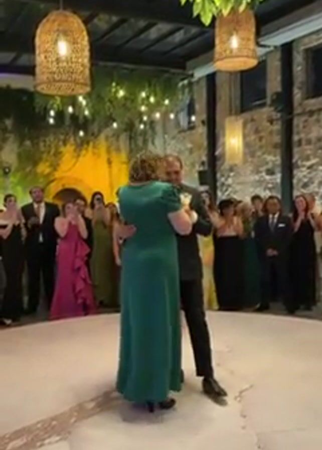 man and a woman dancing on a circular stone dance floor. The man is wearing a black suit and bow tie, while the woman wears a green dress with short sleeves. They are holding each other and smiling as they dance. They are surrounded by guests who are clapping and watching. The room has a glass roof, stone walls, and is decorated with hanging plants and woven light fixtures.