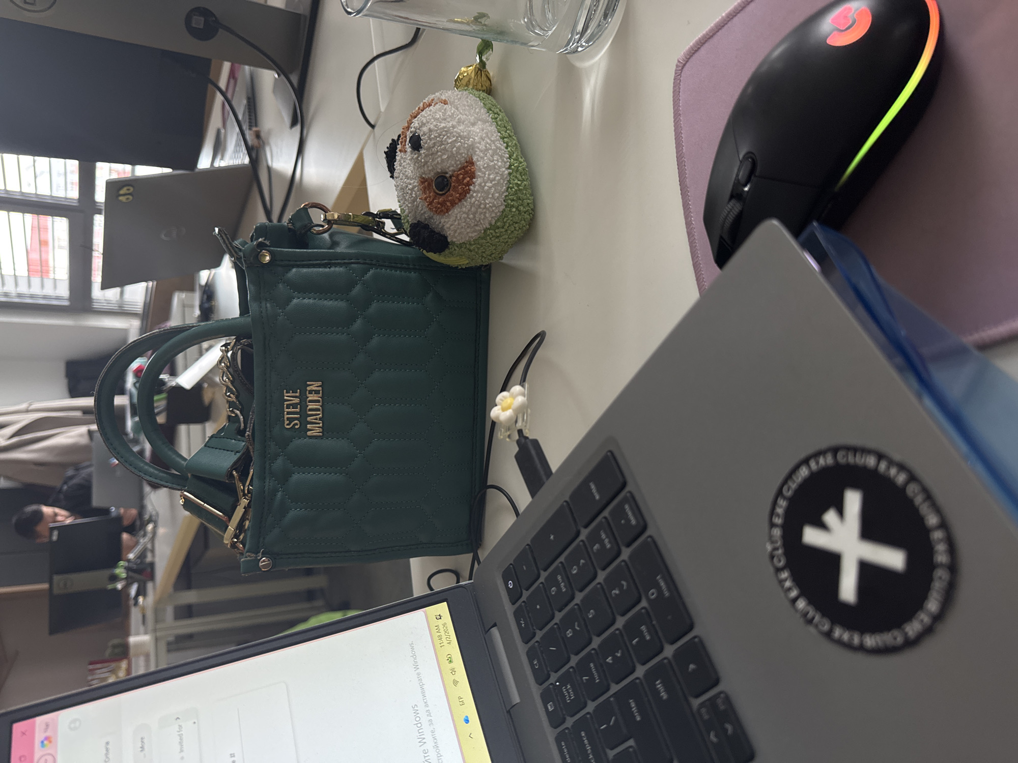 cluttered desk in an office or home office setting. A laptop with a sticker featuring a white cross on a black circle is partially visible in the foreground, with a Windows settings window open on the screen. Next to the laptop is a small, green Steve Madden handbag. A fluffy, avocado-shaped ornament hangs nearby. A black computer mouse with RGB lighting rests on a pink mousepad. The view through the window shows a person working at a desk in the background, suggesting an open office environment. The operating system language is set to Bulgarian (БГР), however the language of the laptop (the actual content) is in English. Given the language of the computer, it can be assumed that the setting is in Sofia, Bulgaria.
