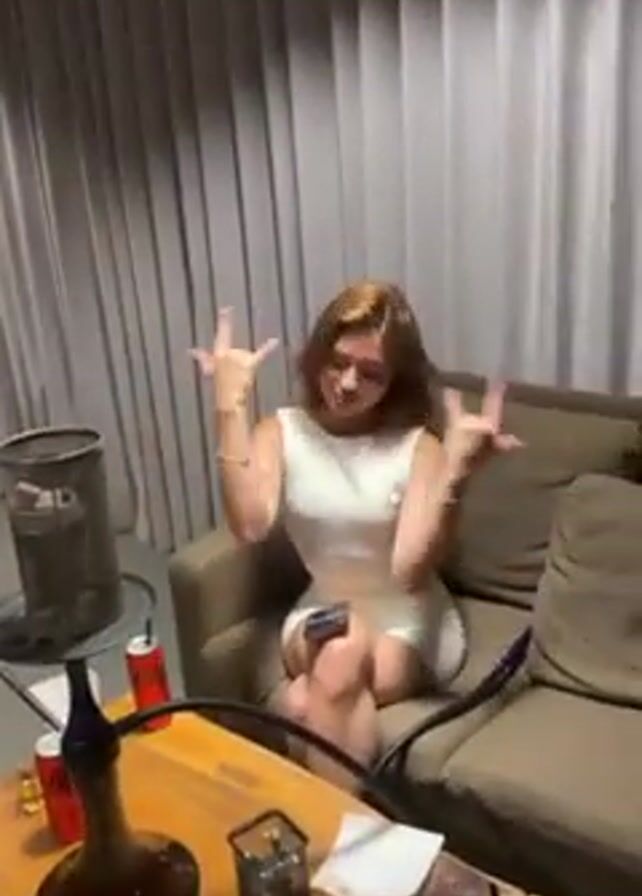 A young woman in a white dress sitting on a couch looks towards the camera, raises her hands, and makes "rock on" hand gestures