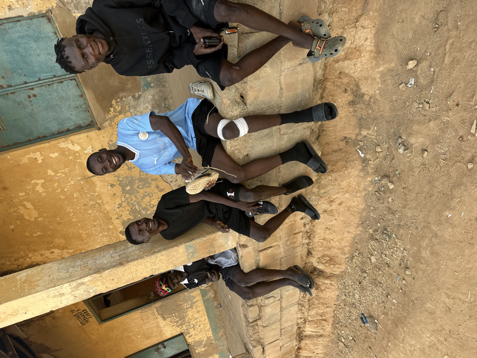 Four young men are positioned one above the other against a building exterior. The top man wears a black hoodie and shorts, holding a phone. The second man sports a light blue shirt, black shorts, and has a bandage on his knee, while holding a shoe. The third wears a black shirt and shorts. The bottom man's attire is partially obscured. They all face the viewer with smiles, creating a casual, friendly atmosphere. The background consists of a weathered building and a dirt ground.
