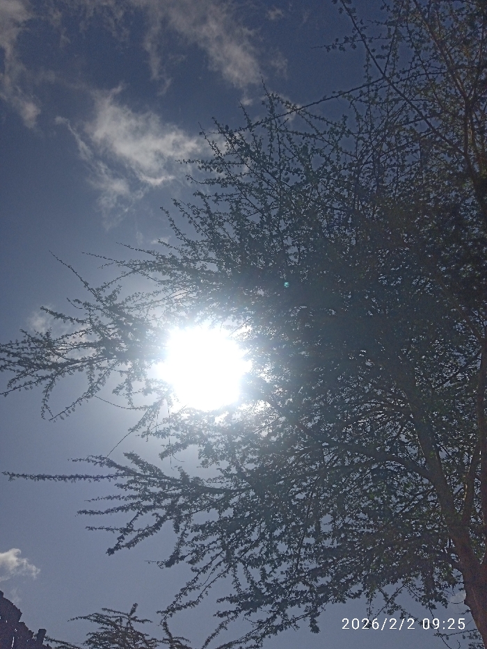 The sun shines brightly through the branches of a tree against a blue sky with scattered clouds. The tree's silhouette is dark, contrasting with the intense sunlight. The lower portion of the image reveals the base of the tree and hints of other structures. A date and time are stamped in the lower right corner: "2026/2/2 09:25." The composition creates a blend of natural beauty and structured form.