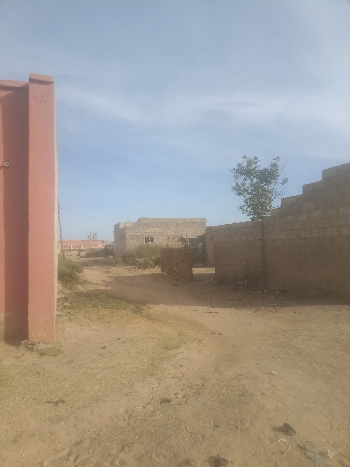 This image displays a dry, unpaved road or pathway in Dabawa, Nigeria, under a clear, light blue sky. The ground consists of light brown sand and dirt with sparse patches of dried green vegetation. In the immediate foreground, a reddish-brown vertical structure, possibly a pillar or part of a building, occupies the left side. The dirt path extends into the mid-ground. To the left of the path, a single-story building constructed from light-colored concrete blocks features a small, dark rectangular window. To the right, a tall, stepped wall, also made of light-colored concrete blocks, runs parallel to the path. A small, leafy green tree is visible behind and above this wall. A pile of reddish-brown bricks or debris is situated near the center-right of the path in the mid-ground. Faint outlines of additional structures are discernible in the distant background along the path. No individuals, animals, or active interactions are present in the scene.