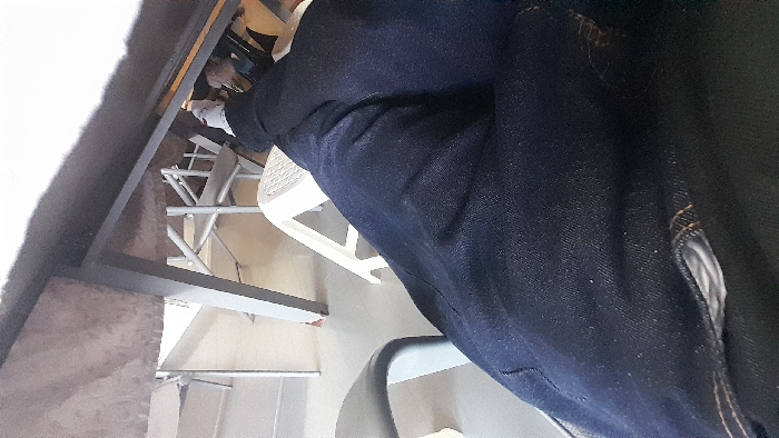 The image provides a low-angle, first-person perspective from beneath a table, focusing on the legs of an individual and their immediate surroundings