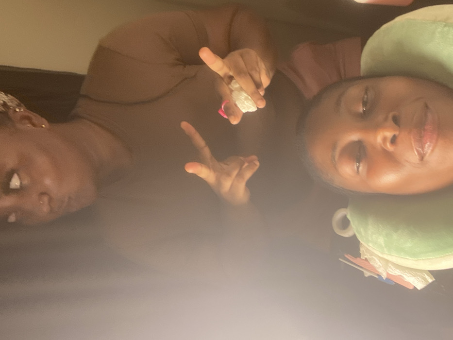 This image, taken in Dome, Ghana, depicts an indoor scene involving two women. In the foreground, a woman with dark skin lies or reclines, supported by a light green neck pillow. Her face is centered, eyes open and looking towards the camera, with a slight smile on her lips. Behind and above her, a second woman with dark skin, wearing a dark brown short-sleeved top, is visible from the chest up. She has a nose piercing and an ear stud. Her head is turned to her right, eyes rolled upwards, and her mouth is pursed. Her left hand is raised, forming a peace sign gesture. Her right hand holds a small, crumpled white object, possibly tissue or cotton, and has a pink elastic band around one finger. To the immediate left of the foreground woman's head, indistinct small items, including a white container and colorful strips, are visible on a dark surface. The background is dark and featureless, with a prominent light flare or haze affecting the upper left portion of the image.