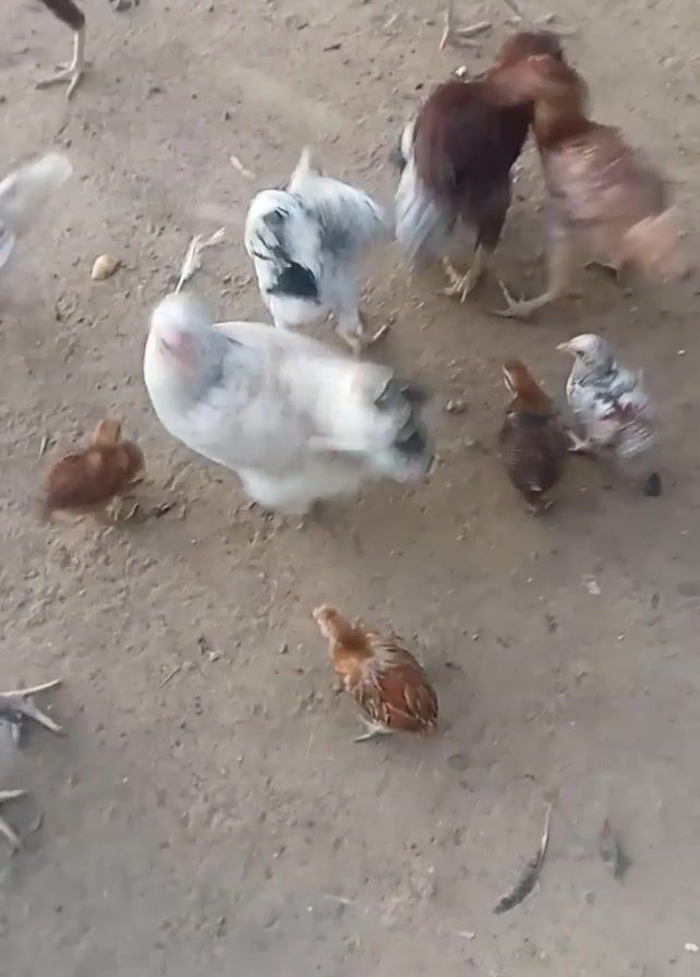 top-down view of about a dozen chickens of various colors and sizes on a dirt ground. The chickens appear to be pecking at the ground and interacting with each other. Some of the chickens are white, brown, and gray. A small part of a white brick structure is visible on the right side of the frame. The chickens are moving around and actively searching the ground. The lighting is natural, suggesting the scene is outdoors.