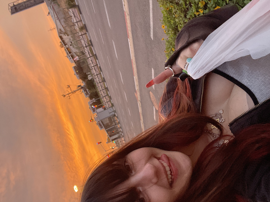 A woman with long brown hair and bangs smiles towards the camera. She is wearing a black zip-up hoodie over a grey shirt, and multiple necklaces. One finger has a red prosthetic extension. She is standing near a road with white lines, and a sidewalk with short sunflowers. The sky in the background is orange, possibly during sunset or sunrise. A building with street lights stands in the distance.