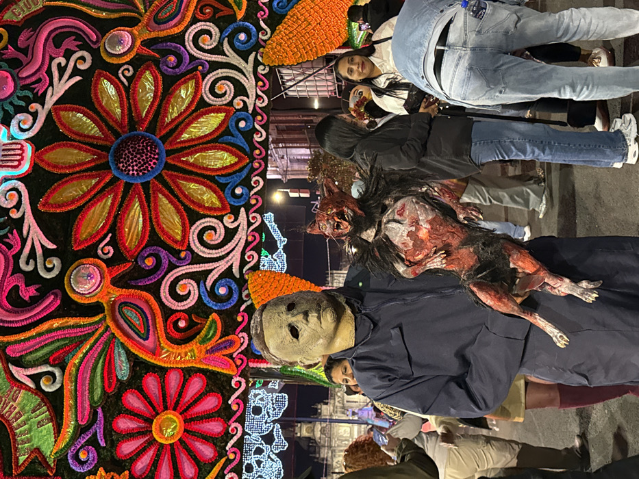 A nighttime scene depicts a crowded outdoor public area in Mexico City, likely near the Zócalo, given the architecture visible in the distant background and the scale of the festive decorations. The overhead area is dominated by a large, intricately patterned archway or canopy featuring vibrant floral designs, hummingbirds, and scrollwork in various colors including red, orange, yellow, green, blue, pink, and purple, possibly constructed from fabric or yarn with reflective elements. Below this, white string lights in the shape of skulls are visible against a dark sky, suggesting a festive event such as Day of the Dead. In the mid-ground, a person wearing a pale Michael Myers mask and a dark blue zip-up jumpsuit stands, holding a prop resembling a grotesque, emaciated demon-like creature with reddish skin, visible ribs, sharp claws, and dark fur patches. The creature's mouth is open, revealing teeth. Surrounding this central figure is a diverse crowd of people. To the immediate right, a woman with dark hair wears a black jacket and blue jeans, and another woman in a white sweater smiles. A person in a light-wash denim jacket and jeans is bent forward, with a clear plastic water bottle clipped to their back waistband. To the left, several other individuals are partially visible, including a person with curly reddish-brown hair and light-colored pants. The ground is obscured by the crowd. Artificial lighting from the decorations illuminates the scene.