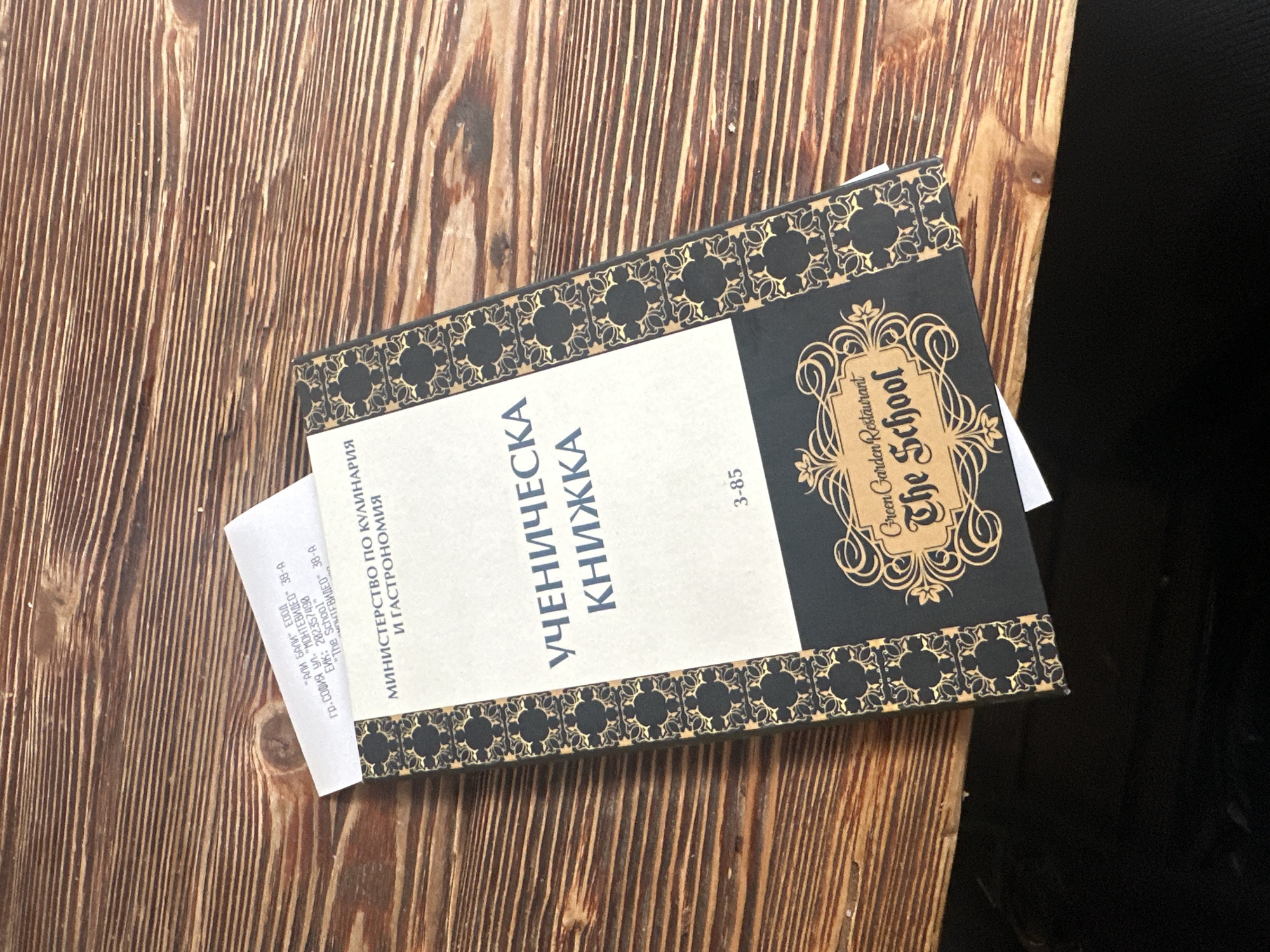 A faux book, serving as a menu or cover, and a paper receipt are positioned on a light brown wooden table surface. The faux book, oriented vertically, features a cream-colored upper section with the Cyrillic text "МИНИСТЕРСТВО ПО КУЛИНАРИЯ И ГАСТРОНОМИЯ" (Ministry of Culinary Arts and Gastronomy) and "УЧЕНИЧЕСКА КНИЖКА" (Student Book), alongside the number "3-85". Its lower section is black, featuring a gold-bordered rectangular emblem with the text "Green Garden Restaurant The School". A white paper receipt is partially tucked underneath the upper left corner of the faux book. The visible portion of the receipt indicates the company name "\"АЛИ БАЛИ\" ЕООД" and the location "ГР. СОФИЯ УЛ. \"МОНТЕВИДЕО\" 38-А" (City: Sofia, Street: "Montevideo" 38-A), with EIK: 282357498, and the restaurant name "\"The School\"". The wooden table exhibits a pronounced horizontal grain pattern. No people or interactions are depicted.