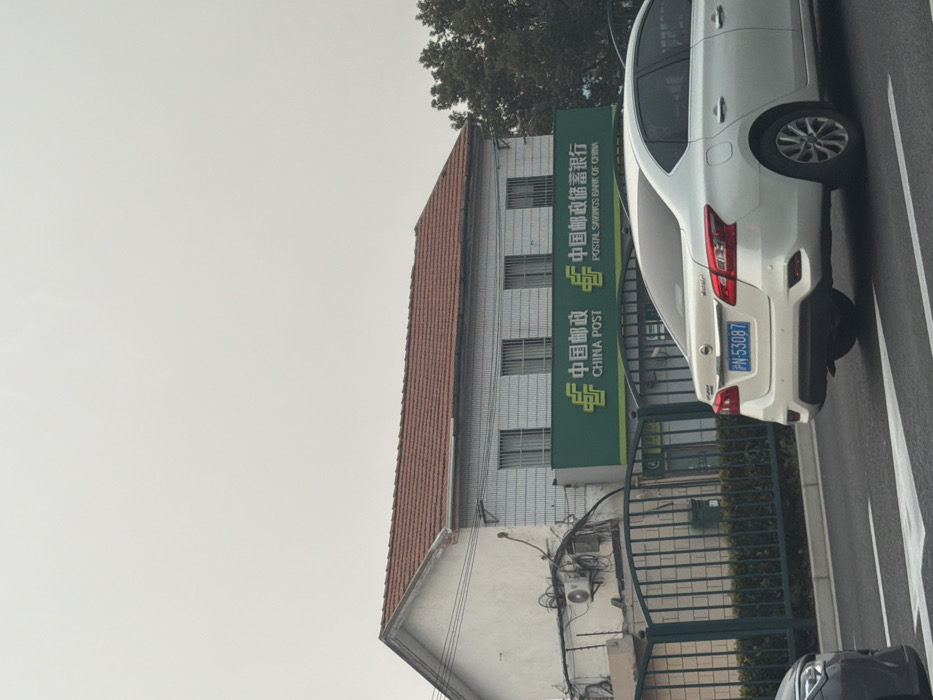 The scene depicts a street view in Pudong, China, under an overcast sky. In the midground, a two-story building features a reddish-brown tiled roof and light-colored, possibly stucco, walls. The building's front facade is dominated by a large green sign displaying "中国邮政 CHINA POST" and "中国邮政储蓄银行 POSTAL SAVINGS BANK OF CHINA" in white text and logos. Four rectangular windows with metal security grates are positioned above the sign. To the left side of the building, external air conditioning units and exposed wiring are mounted on the wall. A dark metal fence encloses the property, behind which a low green hedge is visible. To the right of the building, dense green foliage from trees extends upwards. In the foreground, an asphalt road with white lane markings (solid and dashed) occupies the lower portion of the frame. A white four-door sedan, identifiable as a Nissan Sylphy/Sentra, is parked or driving on the road, facing away from the camera. Its rear license plate reads "沪N·53087". A portion of a dark-colored vehicle is visible in the lower-left corner. No individuals are present in the image.