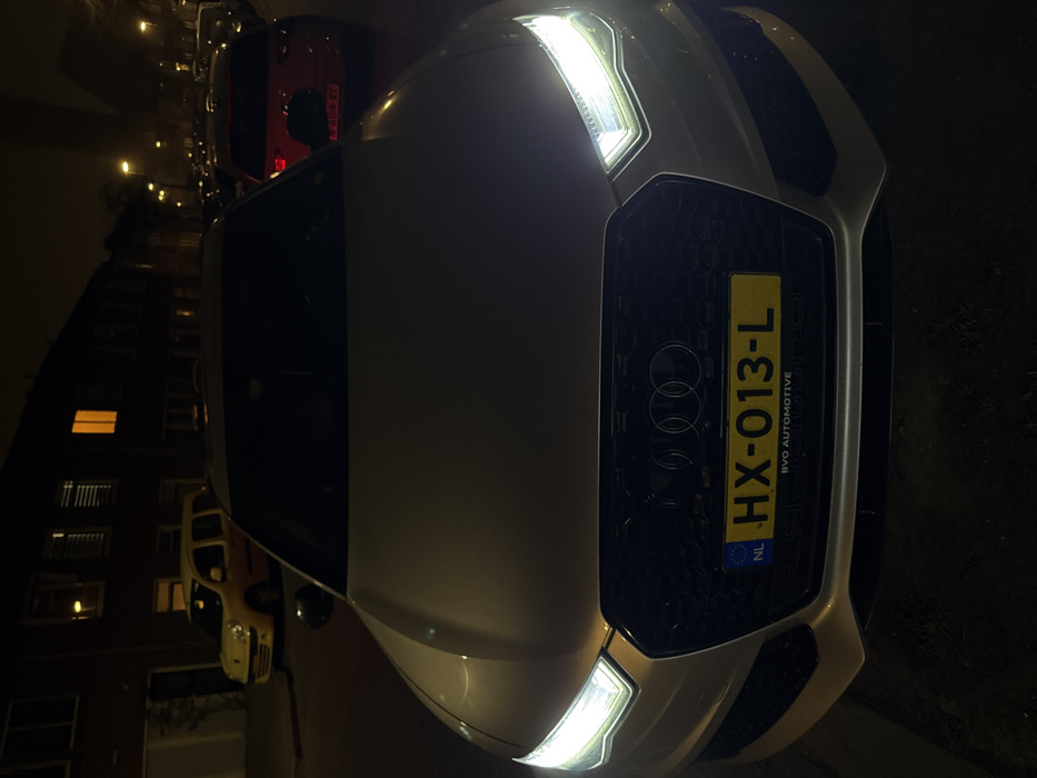 The image presents a nighttime street scene located in Schiedam, Netherlands. The foreground is occupied by the front of a silver/light gray Audi car, likely a sedan or wagon, with its bright white LED headlights illuminated. The vehicle features a large black honeycomb grille with the prominent Audi rings logo and a yellow Dutch license plate, HX-013-L, beneath which "BVD AUTOMOTIVE" is visible on the plate holder. A "QUATTRO" emblem is discernable on the lower part of the grille assembly. In the midground, a residential street extends under artificial light from distant streetlights and illuminated building windows. To the left of the Audi, a yellow Renault Kangoo utility vehicle is parked. To the right, further down the street, a red hatchback is parked, partially obscuring its Dutch license plate, which reads T-604-XT. The background consists of dark, multi-story residential buildings, likely row houses, with several windows displaying interior light, one exhibiting a distinct orange glow. No individuals or specific actions are depicted within the frame.