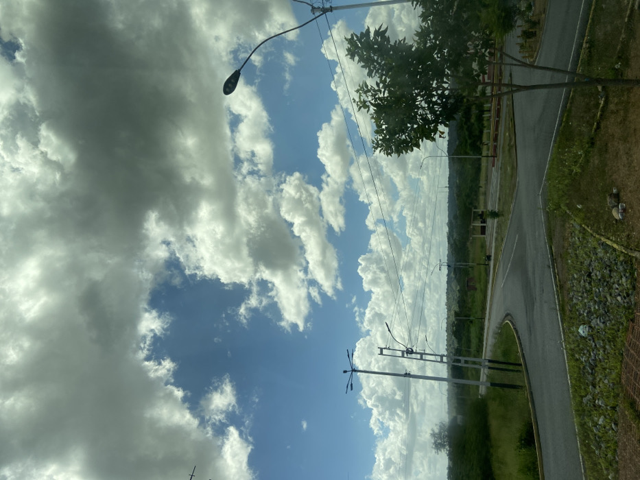 A view of a road curving through a green landscape under a cloudy sky. The sky is a mix of light blue and heavy gray clouds, with telephone poles stretching across the view. A single street lamp is visible in the upper left. Trees line the road, and a patch of lush green vegetation fills the space between the road and the background. The photo is angled, making the horizon line run vertically.