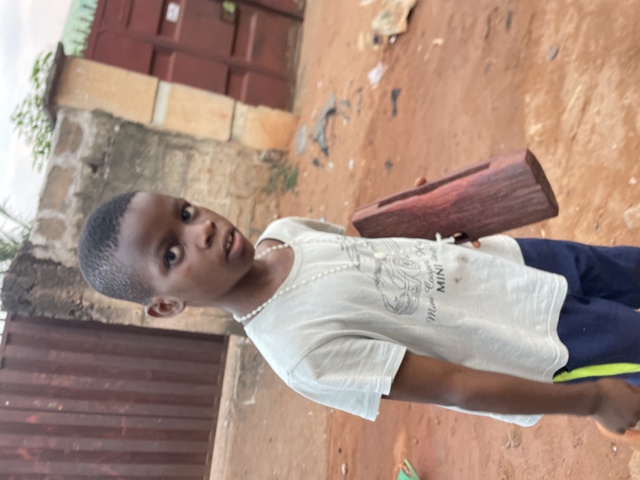 A young boy stands outside in front of a building and dirt. He is wearing a white t-shirt with a car graphic, blue shorts with a yellow stripe, and a white beaded necklace. He is holding a rectangular wooden object with an open, carved groove in his right hand. The building behind him is made of concrete blocks and has a brown corrugated metal door. The ground is a reddish-brown dirt. There is some trash scattered around the background.
