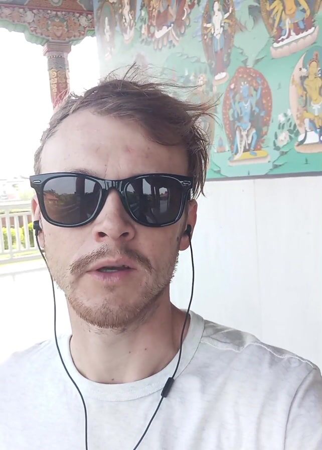 A man with short brown hair, a mustache and a sparse beard stands in front of a wall with colorful murals. He wears a plain white shirt, black sunglasses and black earphones with a cord. He looks directly at the camera and speaks. The camera is positioned at a close-up angle, capturing his face and upper torso. The background includes a view of the exterior of a temple-like structure, adorned with elaborate paintings and architectural details. The colorful murals feature various figures and symbols, likely religious in nature. The man appears to be recording a video or giving a presentation, possibly sharing his experiences at the location.